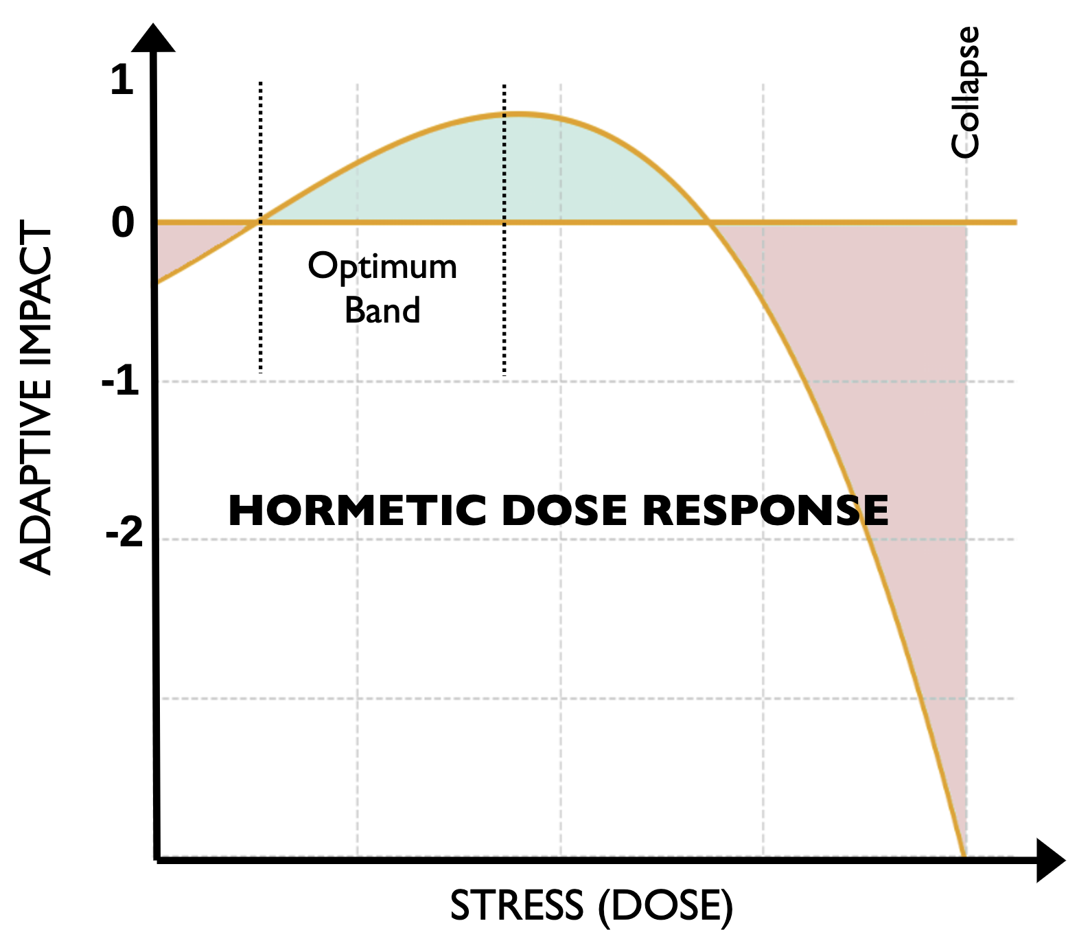 In the model the first half of the green hormetic band is said to be the optimum that supports overall well being. I suppose this is because if further stress fails to produce further benefit, why bother.